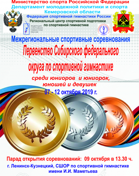 С 7 по 12 октября 2019 года в г. Ленинске-Кузнецком, ГБФСУ КО «Спортивная школа олимпийского резерва по спортивной гимнастике имени » (пр-т Ленина, 2а) состоятся межрегиональные спортивные соревнования – первенство Сибирского федерального округа по спортивной гимнастике.