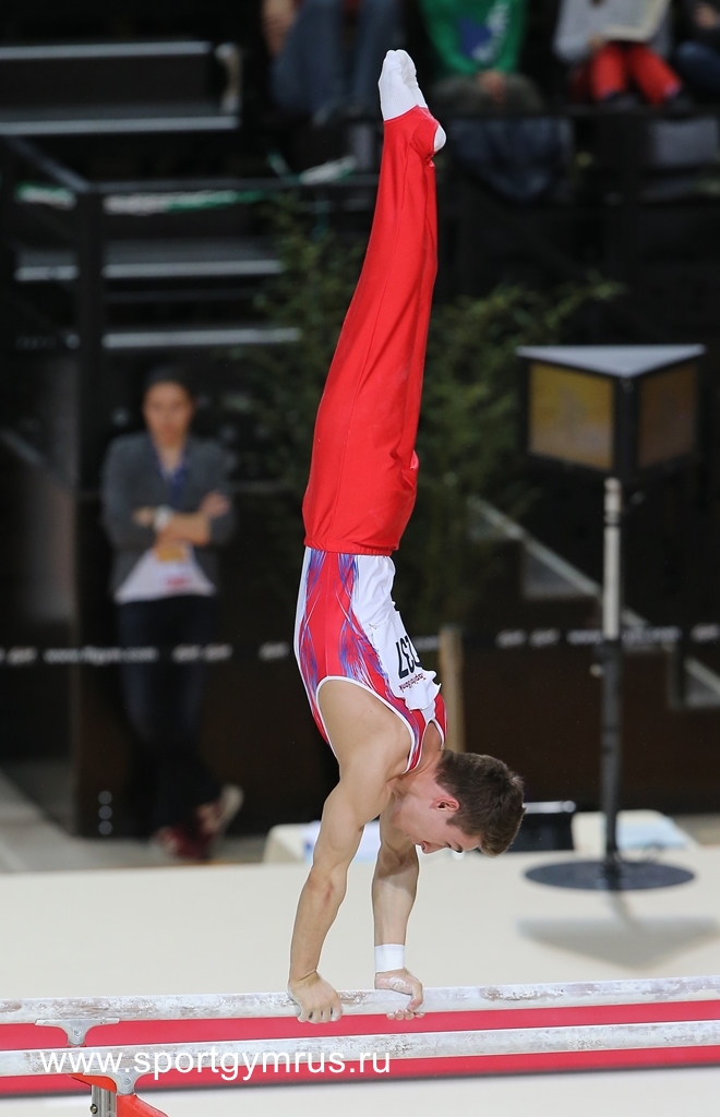 Артур Давтян за очень слабенькую программу на кольцах получает 14.566/5.7 и включается в борьбу. Давид Белявский на кольцах выступает очень и очень прилично, показывает самую сложную свою комбинацию в этом сезоне, но почему-то судьи оценивают его ниже, чем Давтяна – 14.533/6.0. Пёрвис дважды ошибается в стойках на брусьях, но зарабатывает 15.000/6.0 за мёртвый доскок.