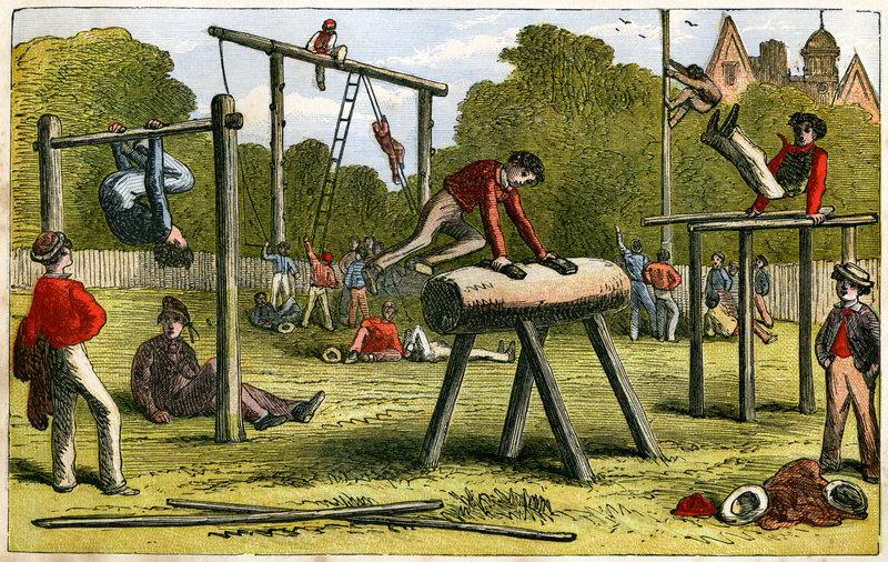 Вначале XIX века немецкий офицер Фридрих Людвиг Янсильно переживал после поражения Пруссии отармии Наполеона. Онсчитал, что поднимать моральный дух населения нужно путем физического развития. Фридрих организовал несколько гимнастических обществ для подготовки молодежи косвободительной борьбе. Именно онввел вобиход брусья, свободные подвесы (прототип нынешних гимнастических колец), бревно и, конечно, коня. Его называют отцом современной спортивной гимнастики.