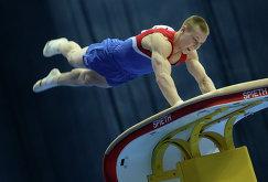 Российский гимнаст Денис Аблязин выполняет опорный прыжок